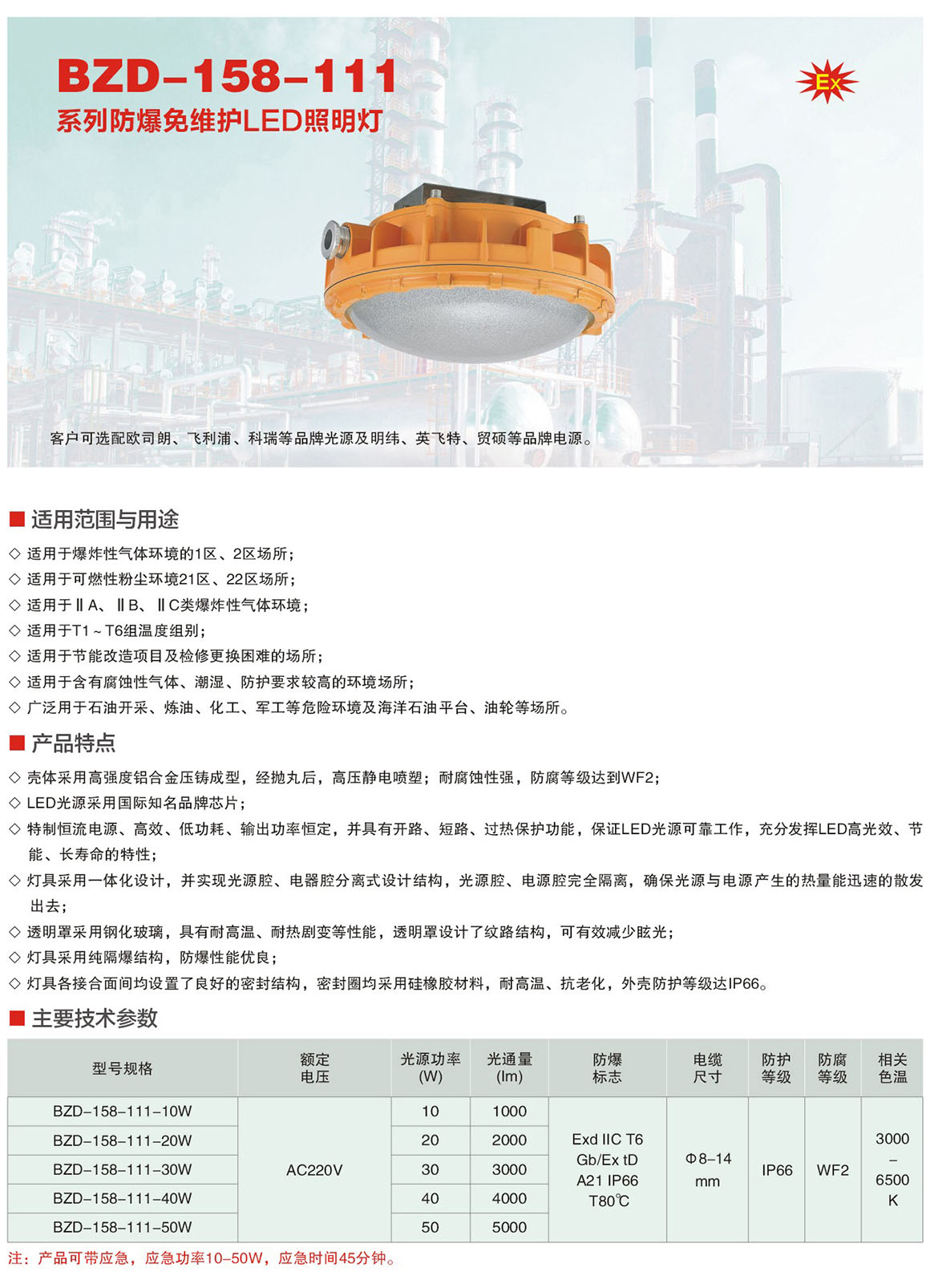 产品中心 防爆(三防)免维护LED灯具系列 BZD-158-111系列防爆免维护LED照明灯(ⅡC)