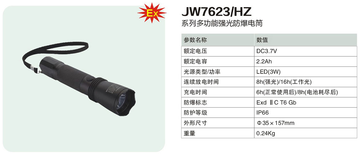 产品中心 移动防爆照明系列 JW7623/HZ系列多功能强光防爆电筒(ⅡC)